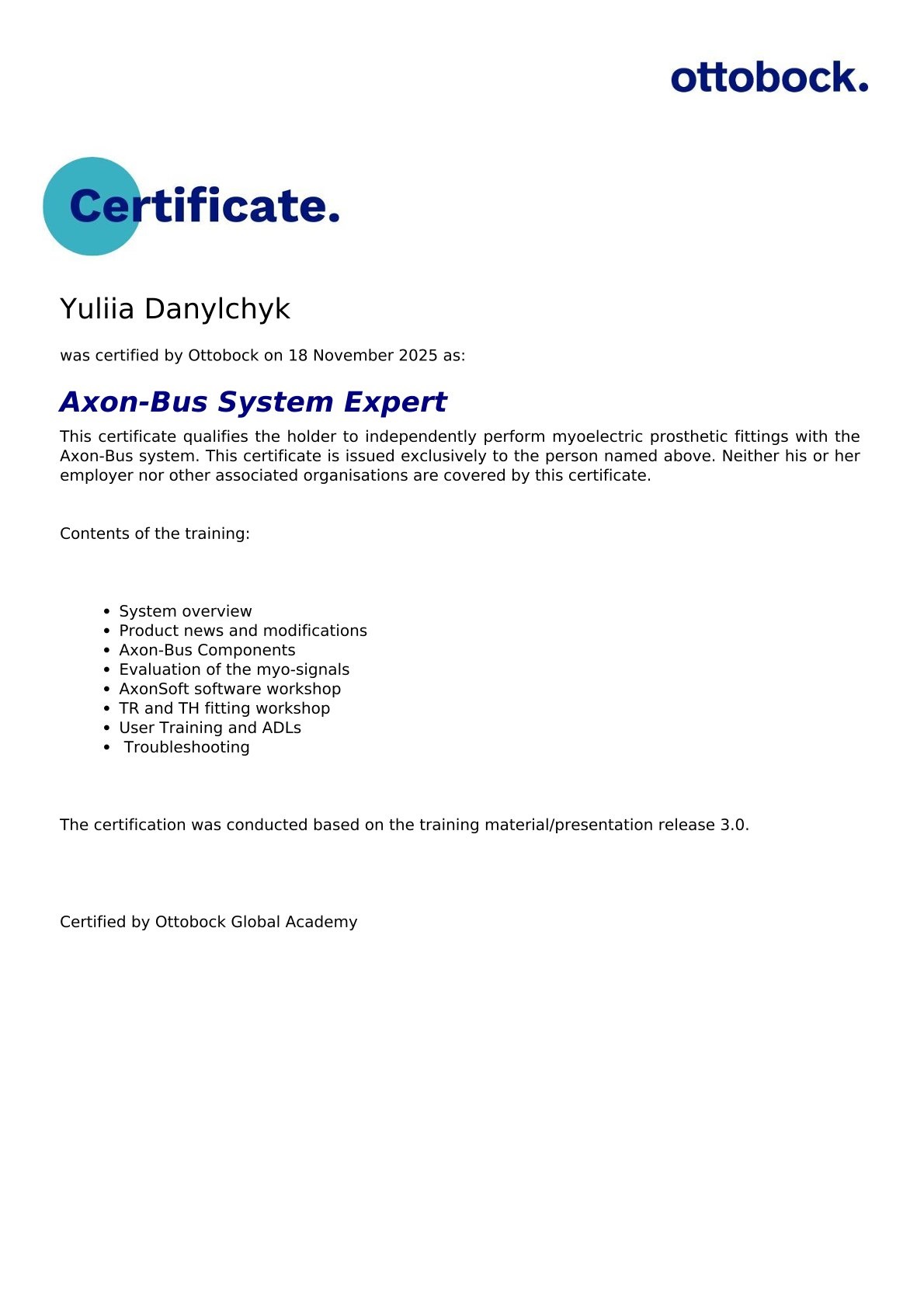 Сертифікат про проходження навчання Юлії Данильчик в компанії Ottobock, Німеччина